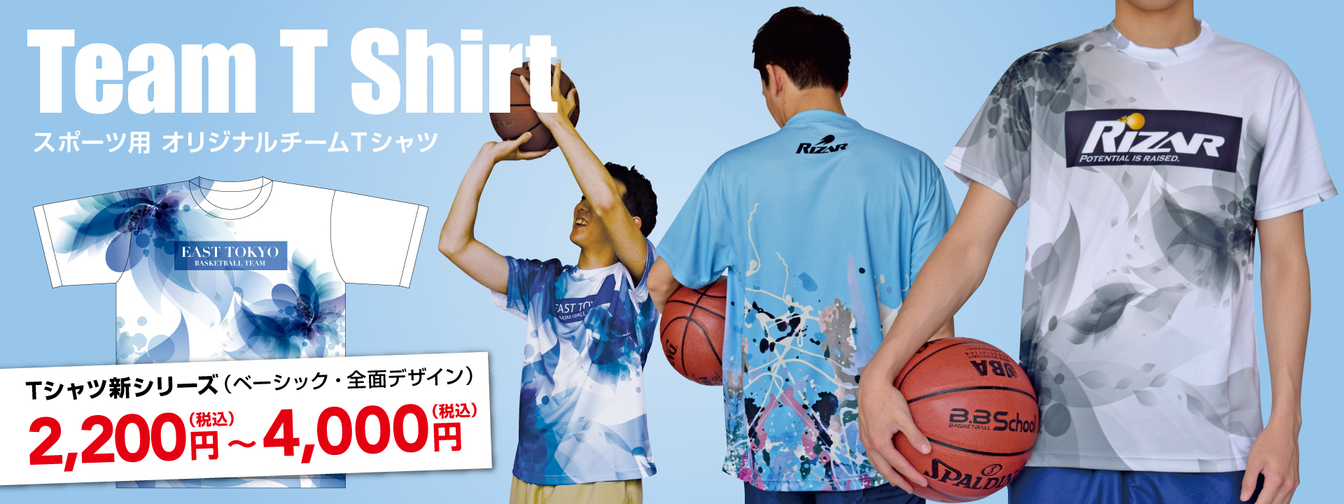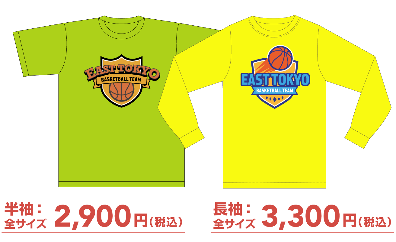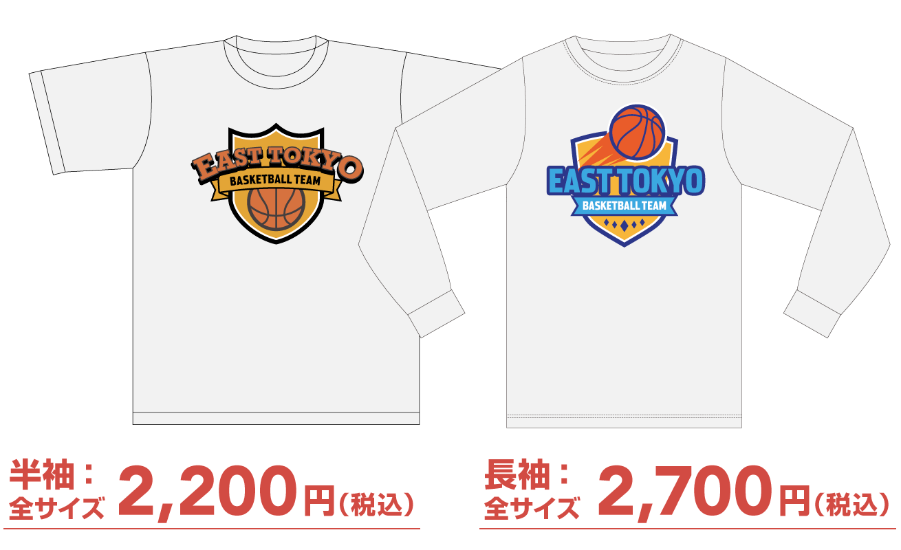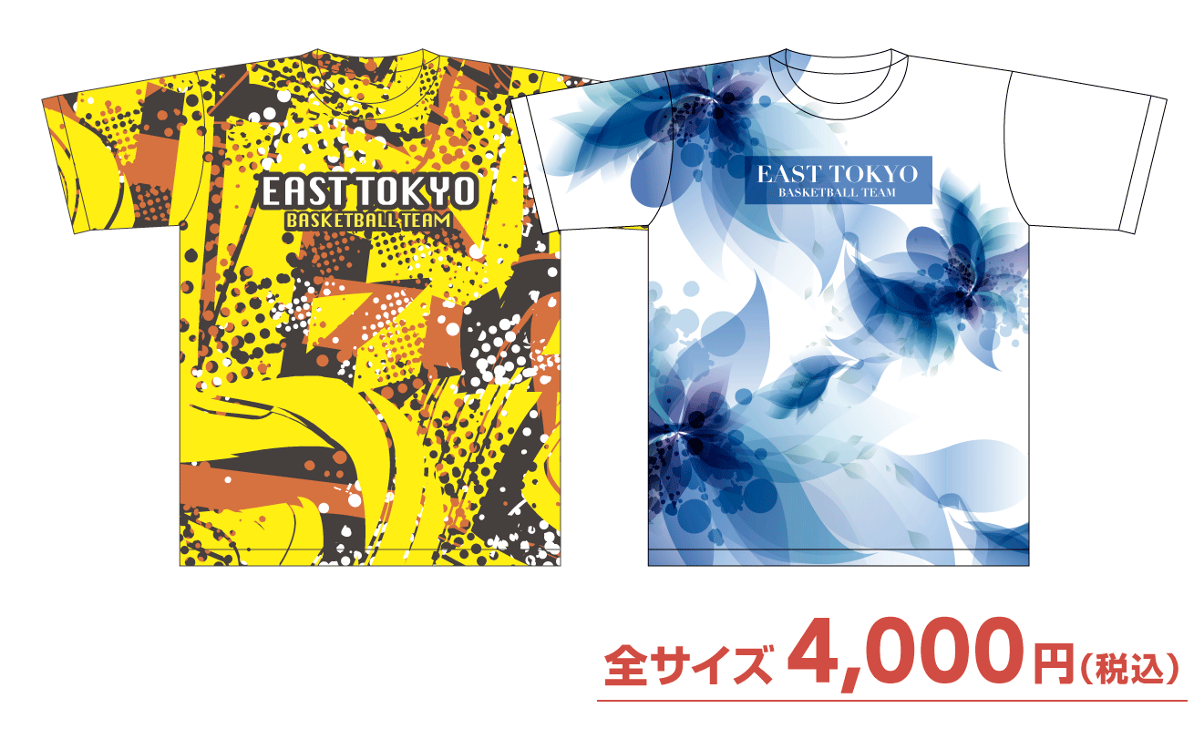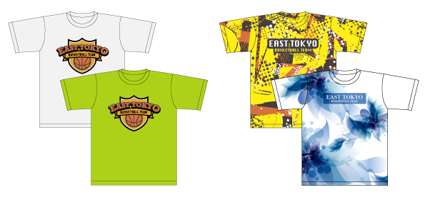 生地のカラーとロゴのタイプ・カラー・位置を選ぶタイプのベーシックタイプTシャツと、5パターンのデザインから3タイプの色を選べる全面デザインタイプTシャツをご用意しております。